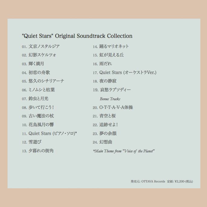 アルバムタイトルの「Quiet Stars」はもう一つの放送局 Voice of the Planetのテーマ曲。制約の厳しいストリーミング配信において優れた選曲を長年続けているOTTAVAに敬意を表して、番組内で自由に使えるオリジナル音源の数々を作曲・演奏しました。